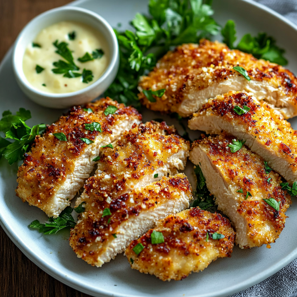 Crispy, golden Parmesan crusted chicken breasts cooked in an air fryer, delivering juicy, restaurant-quality flavor in 20 minutes. A quick, no-oil method with aromatic garlic, Panko, and Parmesan for bold umami and crunch.